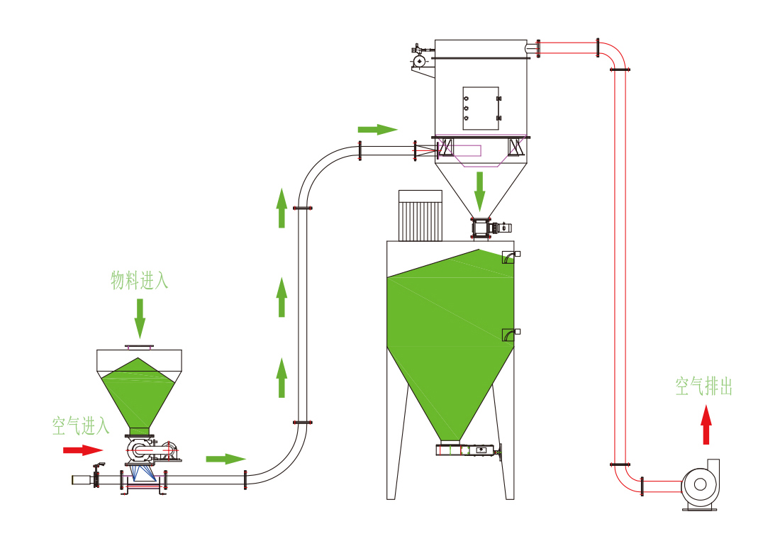 該輸送方式設備簡單,可輸送用壓送式供料難以輸送的物料,適用于間隙輸送或者連續輸送。