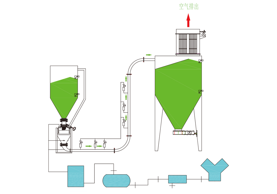 該輸送方式將流態化的物料作栓流輸送,輸送時速度極低,耗氣量小,能耗小,輸送過程中粒子的破碎小,末端的收塵裝置簡單。