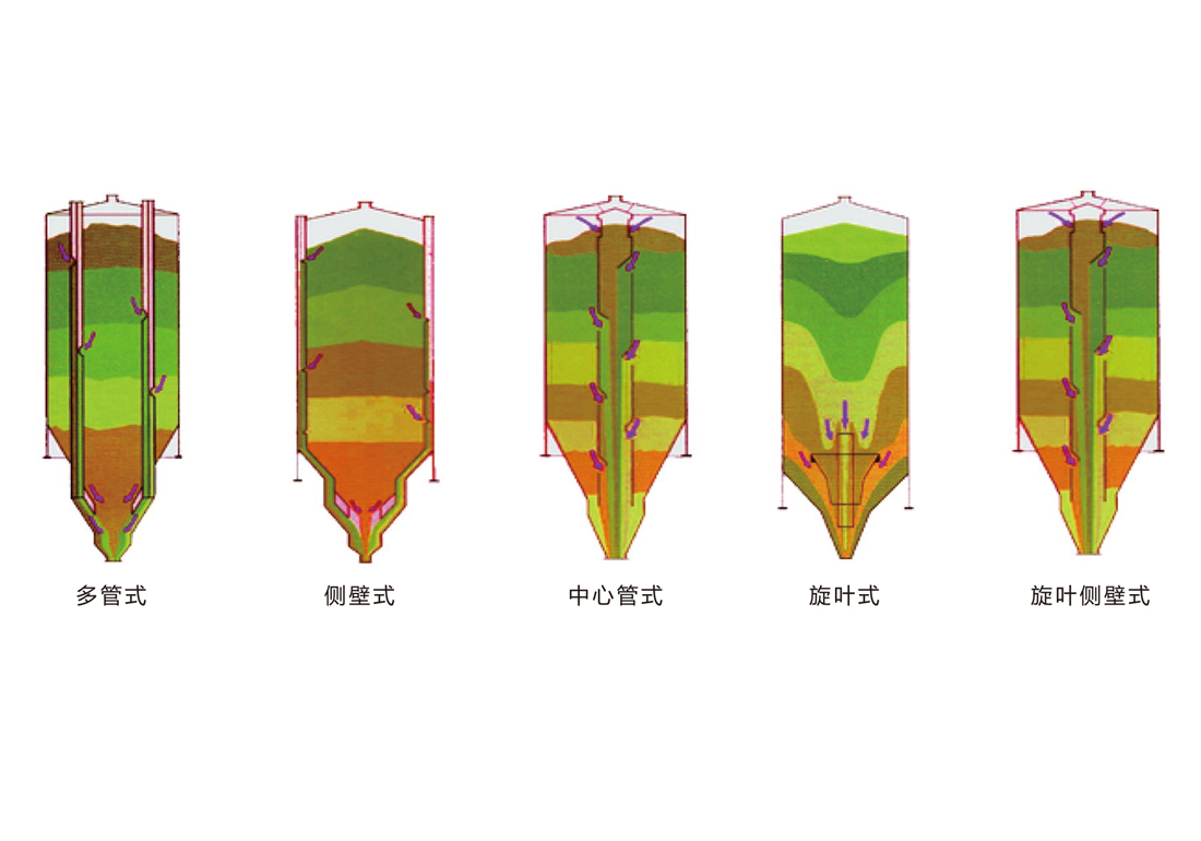 重力式摻混均化料倉原理為通過科學(xué)設(shè)計,利用多股氣流將物料從倉內(nèi)不同高度、不同方位有選擇的同時進(jìn)入倉底,從而實現(xiàn)摻混均化的目的,大大改善粉粒料不同批次及品種物性(如熔融指數(shù)、粒度、色比度、亮度等)的一致性。